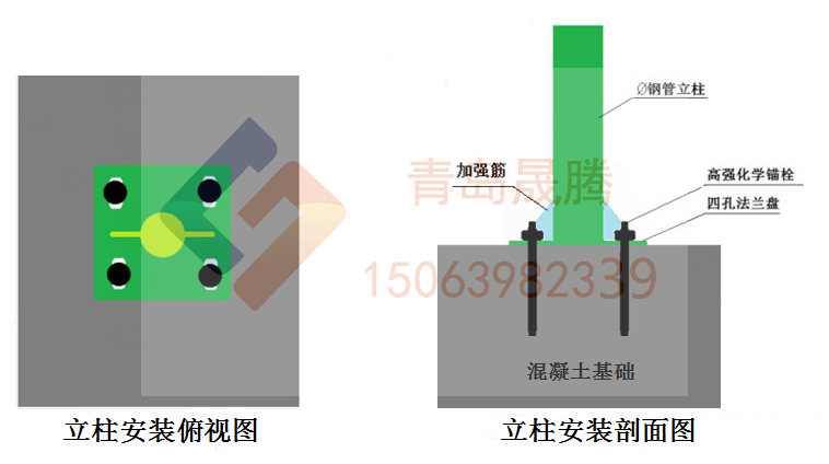 3.3組裝好一部分框架就一起扶起,第一個安裝立柱到定點位置后采用化學(xué)錨栓將法蘭盤固定孔位固定住,注意化學(xué)錨栓的螺帽不要擰死,然后依次順序固定;